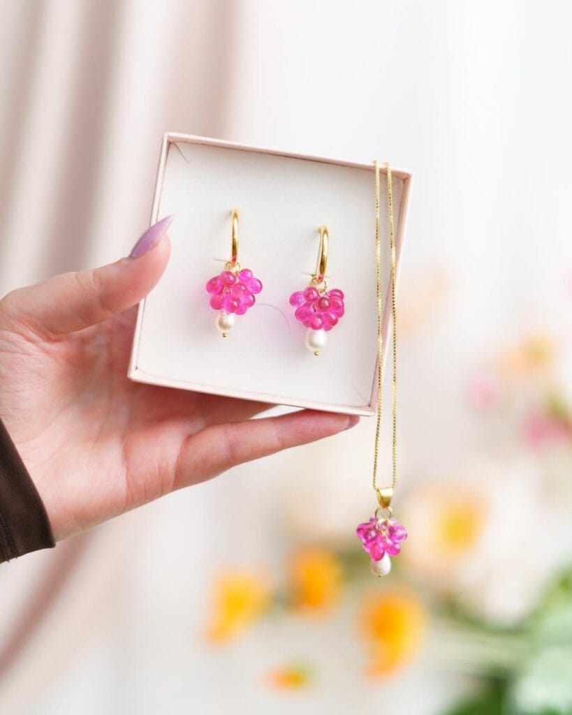 Kuvassa kädessä korvakorurasia jossa pinkit kultaiset helmikorvakorut ja helmikaulakoru