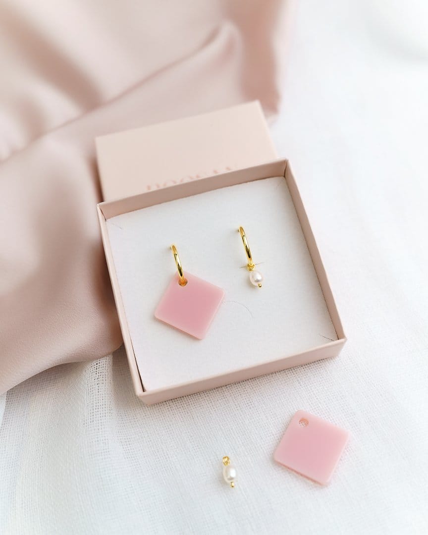 Korvakorujen materiaalina on käytetty italialaista selluloosa-asetaattia, jota voidaan kutsua ”biomuoviksi”, sillä se on valmistettu selluloosasta ja kasvikuiduista sekä se on myös biohajoavaa. Makeanvedenhelmien koko, muoto sekä sävy saattaa vaihdella poiketen tuotekuviin. Korujen metalliosat ovat laadukasta 925 sterling-hopeaa 18 karaatin kultauksella. Korut toimitetaan kauniissa, vaaleanpunaisessa korurasiassa.